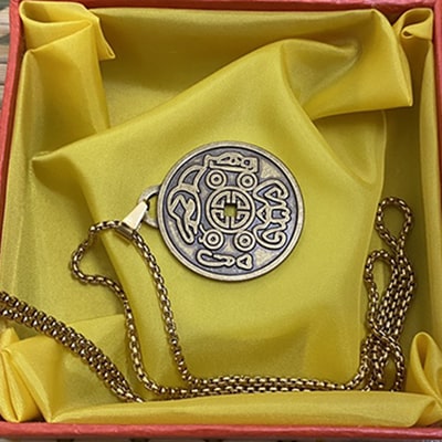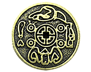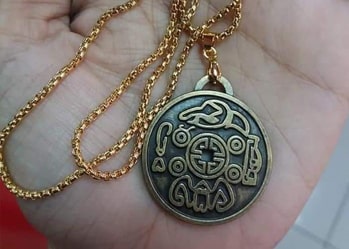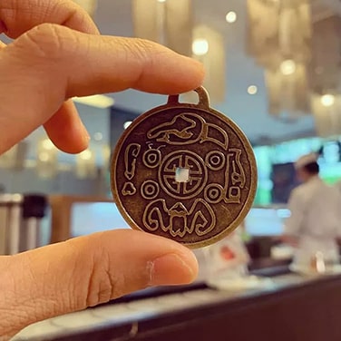 Nói rồi chị chỉ vào màn hình điện thoại. Trong đó là ảnh của một vật có hình dạng và màu sắc gần giống như đồng xu, với hoa văn chạm khắc kỳ công 2 ở mặt. Chính giữa có một cái lỗ, phía trên cũng có thiết kế riêng 1 khoảng trống, tôi đoán là để xỏ dây vào.